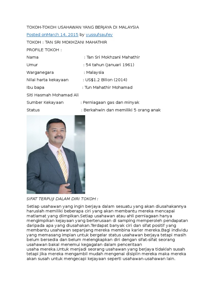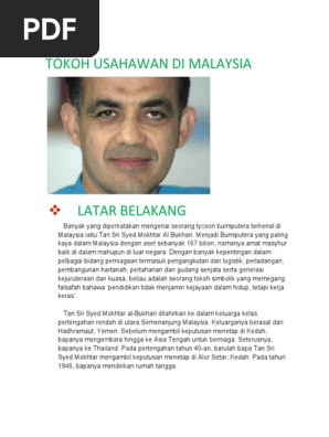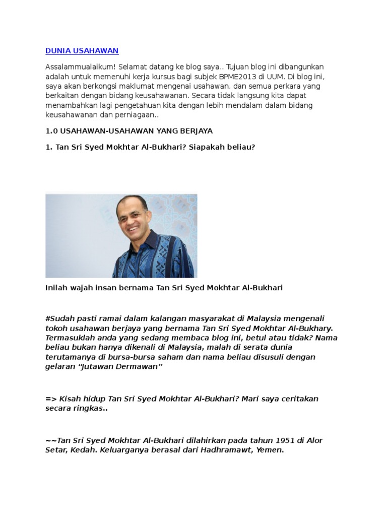 Rahsia Kejayaan Tokoh Usahawan Tuesday 10 December 2013. Bagi memilih seorang tokoh usahawan yang berjaya berdasarkan contoh-contoh tokoh yang telah dipelajari Tan Sri Syed Mokhtar Al-Bukhary merupakan insan yang pengkaji pilih atas dasar kejayaan beliau dalam menjadi antara salah seorang usahawan Bumiputera yang terkaya di Malaysia. Oleh sebab itu untuk saya mendefinisikan siapa usahawan yang berjaya di Malaysia saya tidak hanya memandang kepada kejayaan mereka mengumpul harta semata-mata tetapi juga termasuk kriteria-kriteria lain yang membezakan antara usahawan dan ahli perniagaan.